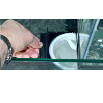 En el caso de un bloqueo en la bajante regulada, una tubería de desbordamiento de emergencia adicional proporciona un flujo libre sin restricciones de agua del acuario directamente al sumidero.