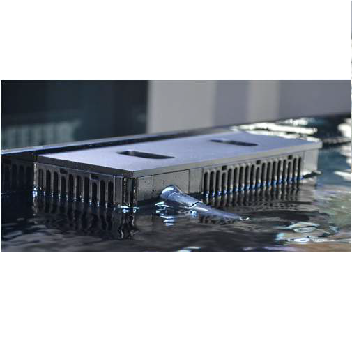 Los peines removibles que rozan la superficie rodean la parte superior de la caja de desbordamiento ubicada en el centro que alberga la bajante, el tubo de retorno del sumidero y la discreta boquilla de salida de retorno de «globo ocular» multidireccional.