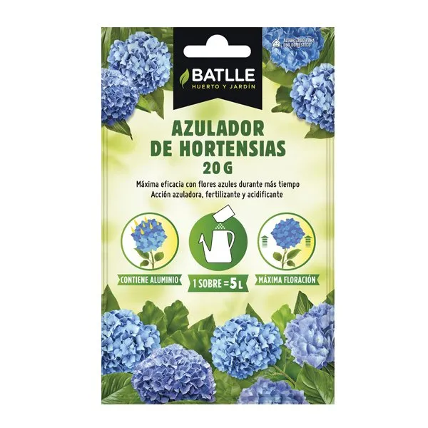 -El Fertilizante soluble Azulador Hortensias es un abono en forma de cristales solubles, que incorpora aluminio al suelo, responsable de la coloración azul de las flores de las hortensias, acidificando la disolución de riego y el medio de cultivo al mismo tiempo.