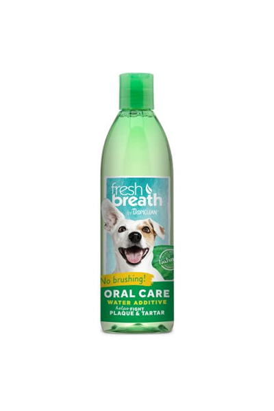 Aditivo para agua Fresco Aliento para perros Tropiclean, Remedia el mal aliento y la formación de placa en la boca de tu perro. Brinda comodidad para el mantenimiento de la salud canina bucal. Como un aditivo para agua benefico que es natural, el Fresco Aliento de Tropiclean ha sido formulado para proporcionar a los perros un cuidado diario de higiene oral. Si tu perro tiene mal aliento y te gustaría hacer algo al respecto, no busques más, este conveniente aditivo para agua es lo que necesitas. Al simplemente añadirlo al agua para beber de tu perro, puedes ayudar a promover una mejor higiene oral y combatir la halitosis canina así como también ayudar a prevenir la formación de placa y sarro. Sin el cuidado dental apropiado, 70% de los perros comienzan a mostrar señales de enfermedades bucales a los 3 años. Las enfermedades bucales puede llevar eventualmente a la perdida de dientes y otros serios problemas de salud. Remedia el mal aliento con aditivo para agua fácil de usar. El aditivo para agua natural Tropiclean promueve encias saludables y elimina el mal aliento por hasta 12 horas.