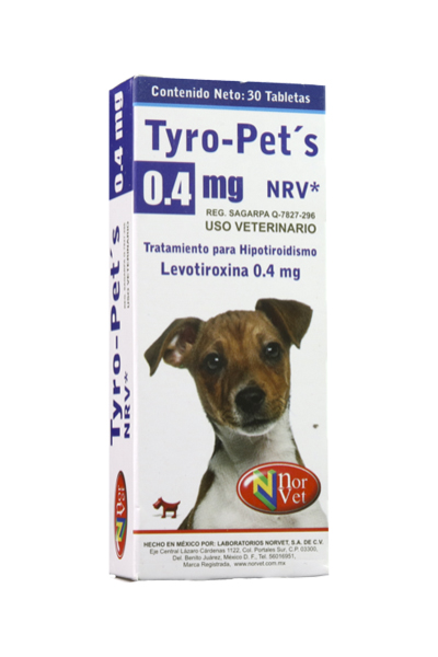 En Animarket Farmacia Veterinaria comercializamos TYRO PETS 0.4 mg de laboratorios NorVet, en la presentación de caja x 30 comprimidos de Levotiroxina de 0,4 mg.