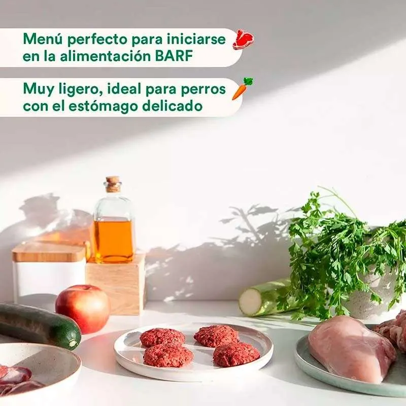 El menú BARF de pavo para perros es monoproteico y muy completo, ya que incluye además de un 80% de pavo, un 20% de frutas y verduras frescas. La carne de pavo es muy baja en grasas, iniciarse en la alimentación natural con esta proteína también es muy buena opción. Te aconsejamos incluir el menú BARF de pavo en su dieta si tu perro sufre problemas digestivos.